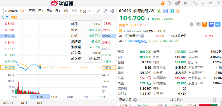 8月12日上午,哔哩哔哩(B站)港股跌近9%。此前四个交易日,哔哩哔哩已经四连阴,累计跌幅超8%。加上今日的跌幅,五日已跌去16%以上。