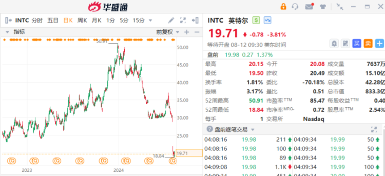 随后,英特尔宣布100亿美元成本削减计划,将裁员超过15%,自2024年四季度开始暂停派息。英特尔在8月1日发布盈利报告后的第二天,市值跌去超四分之一多,此后又下跌了8%。自首席执行官Pat Gelsinger在2021年初,重返英特尔后并阐明其扭亏为盈计划以来,该公司股价已下跌约68%。同期,标普500指数上涨了39%。