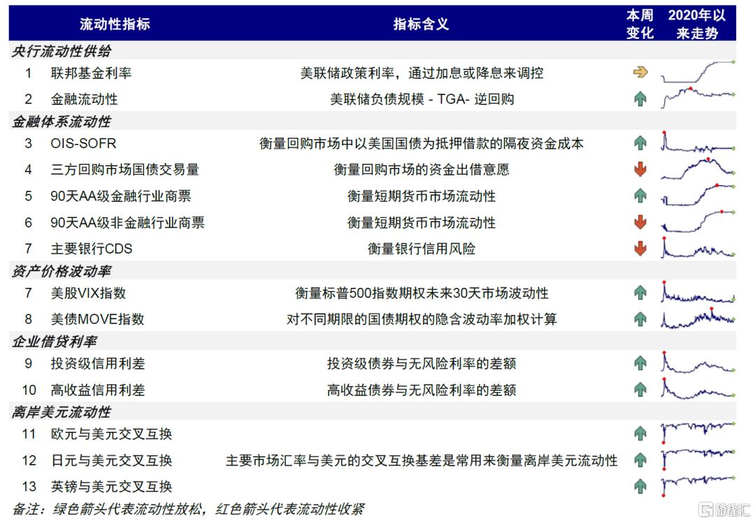 衡量美国金融市场流动性可以从央行投放、金融系统、资本市场、企业部门和离岸市场等五个维度着手,刻画上文中提到货币传导路径中不同层级的流动性情况,具体来看:1)央行金融流动性指标(美联储负债-TGA-逆回购,近似等于商业银行准备金规模),从“量”的角度衡量美联储和财政对金融体系流动性的影响,这一指标对美股中期走势也有较好的预测效果(《美国流动性或将迎来拐点》);2)OIS-SOFR利差,表征美国银行体系之间的流动性紧张程度;3)投资级和高收益级信用利差,金融与非金融商票利差,都可以衡量企业融资成本;4)美股VIX和美债MOVE指标衡量资产价格波动;5)主要汇率与美元的交叉互换,刻画离岸美元的紧张程度。我们在图表26梳理了上述五个维度的13个指标,供投资者参考。
