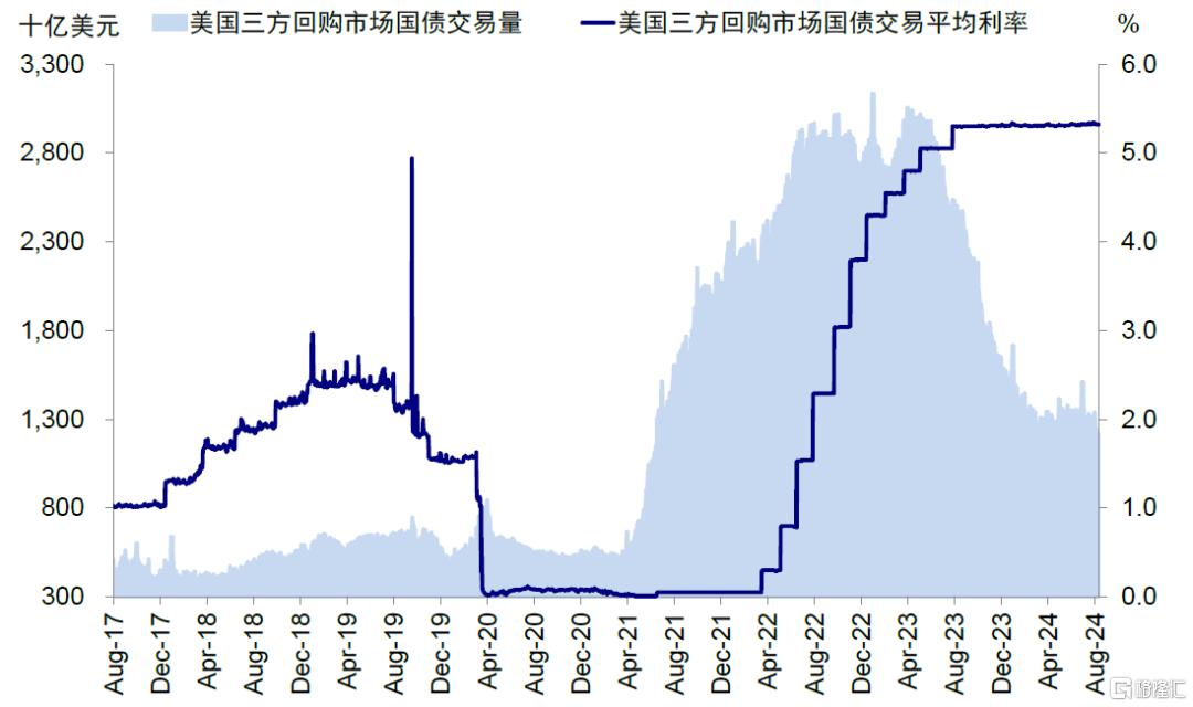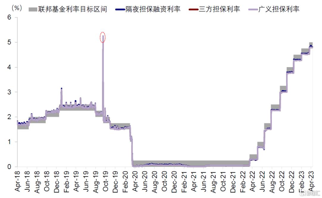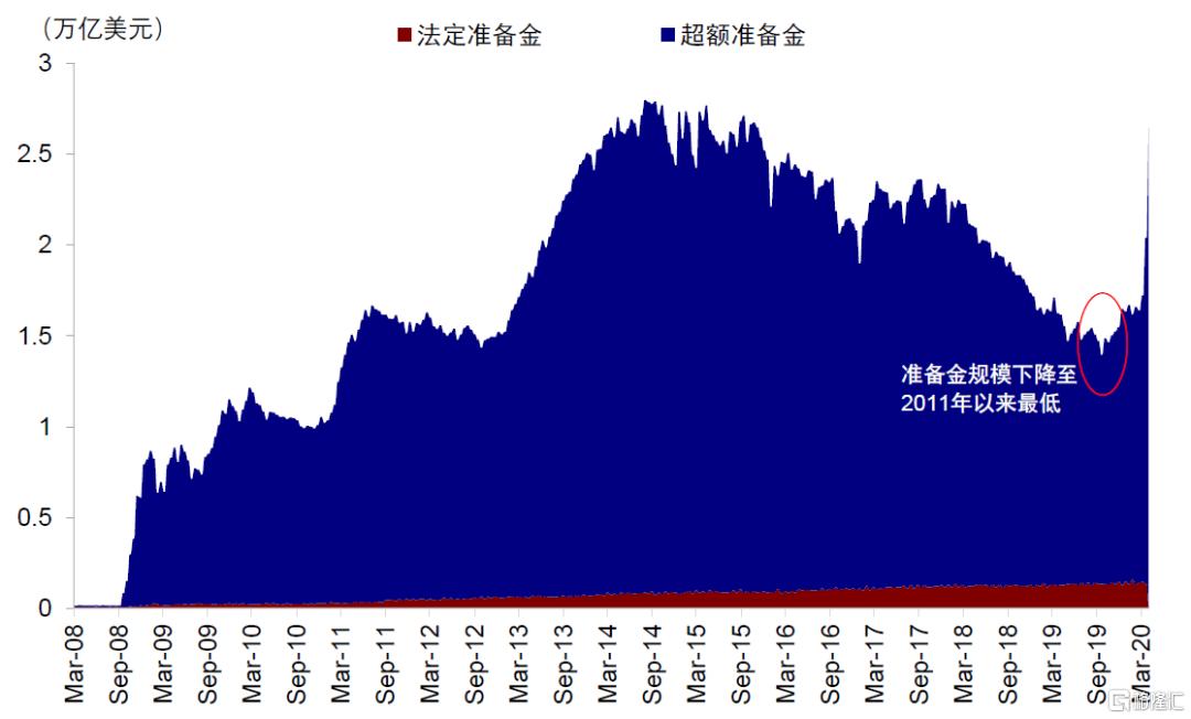 季度税款缴纳、债券发行规模增加、准备金短缺三重因素酿成货币市场流动性冲击。2019年9月16日,联邦基金市场和隔夜担保融资利率(EFFR和SOFR)较前一交易日分别上行13和11bp,并于17日进一步走阔,EFFR突破联邦基金目标利率上限(2.25%),SOFR盘中更是一度突破9%(当日收于5.25%)。究其原因,有3个主要因素:1)企业季度税款缴纳:9月16日是美国季度税款缴纳的最后期限,企业从货币市场基金和银行体系内提取流动资金向财政部上缴税款,财政部将其存储在位于美联储的TGA账户,导致货币市场基金面临流出压力;2)债券发行规模增加,一级交易商拍卖购买国债融资需求增加:同日美国540亿美元的长期国债结算,这导致拍卖购买这些国债的一级交易商通过回购市场获取相应资金的融资需求大幅增长;3)美联储资产负债表正常化导致准备金减少:随着2017年10月以来美联储开启资产负债表正常化的进程叠加国债大量发行使得银行持有的国债越来越多,而银行体系内的准备金持续减少。2019年9月中,银行体系的准备金一度回落至2011年以来的最低点,体现了短期流动资金的短缺。