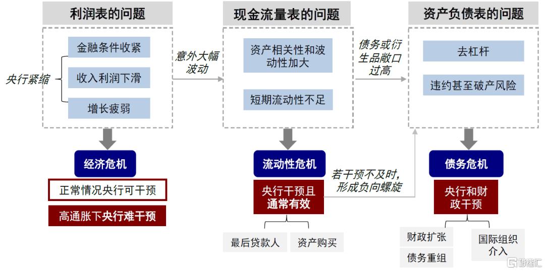 回顾历史经验看,增长压力、流动性冲击和债务危机是一个经济周期中可能遇到的不同“麻烦”(《加息后期的“麻烦”与资产表现特征》),这又分别对应我们熟悉的企业三张表中的利润表、现金流量表(融资现金流和投资现金流)和资产负债表的问题;利润表体现需求的强弱、现金流量表刻画获取资金的难易、资产负债表则展现偿付能力和杠杆水平,极端情形下分别对应衰退、流动性挤兑与债务危机,具体来看: