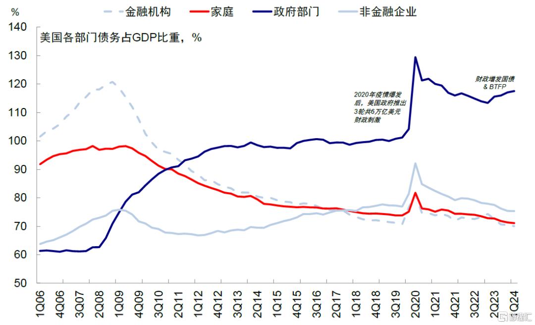 其次,从资产负债表看,得益于政府加杠杆帮助居民去杠杆,美国私人部门资产负债表也相对健康,明显低于2008年金融危机水平,也是当前不面临系统性风险的核心原因。