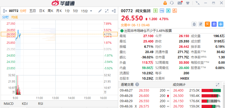 8月13日,阅文集团(00772)早盘高开,截至发稿,涨4.73%,报26.55港元,成交额5195万港元。
