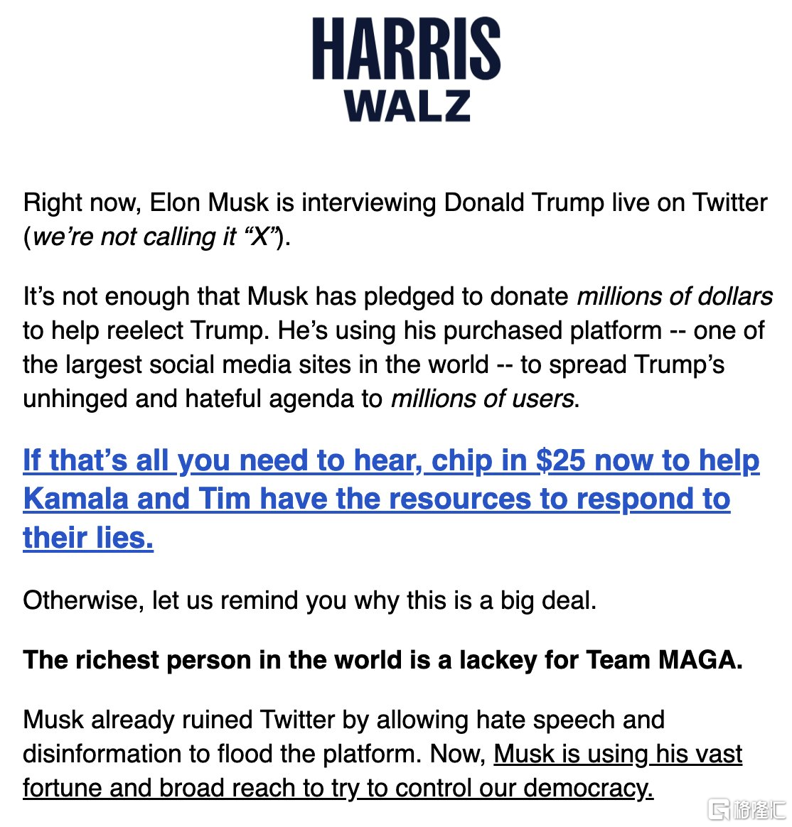 竞选邮件中写道:“马斯克承诺捐赠数百万美元帮助特朗普连任还不够。他还利用自己购买的平台——全球最大的社交媒体网站之一——向数百万用户传播特朗普疯狂而充满仇恨的议程。”