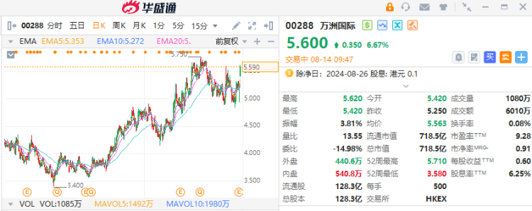 8月14日讯,万洲国际(00288)早盘高开逾3%,截至发稿,涨6.67%,报5.60港元,成交额6010万港元。