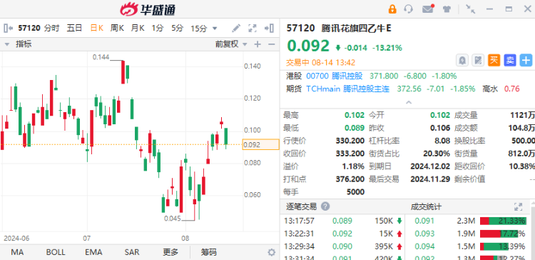 腾讯 $00700.HK 今天公布业绩,其绩前走势颇强,截至上日连续5日录得升幅,收复50天线。 投资者如看好腾讯,或可留意腾讯牛57120 $57120.HK ,收回价333.2港元,杠杆比率8.2 倍,换股比率500 兑1,2024年12月02日到期;如看淡,或可留意腾讯熊58699 $58699.HK ,收回价422港元,杠杆比率8.6 倍,换股比率500 兑1,2026年12月02日到期。