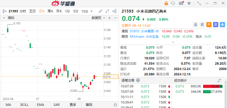 小米 $01810.HK 于200日线见支持展开反弹,上日向上试探50天线。据相关机构统计,小米手机于第二季度海外的市场份额显著增长,在拉美市场排名第二,东南亚的市场份额亦显著增长,另外,在日本出货量则挤身前三。 投资者如看好小米,或可留意小米购21593 $21593.HK ,行使价19.82港元,实际杠杆7.2 倍,换股比率10 兑1,2024年12月24日到期;如看淡,或可留意小米沽25496 $25496.HK ,行使价13.86港元,实际杠杆9.8 倍,换股比率5 兑1,2024年11月08日到期。