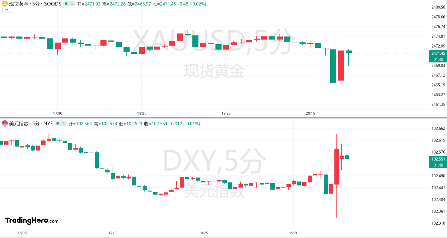 数据公布后,现货黄金短线迅速上扬近10美元,而后有所回落,短线波动近15美元;美元指数短线波动超20点;非美货币普跌,欧元兑美元短线下挫30点;英镑兑美元短线下挫超30点。