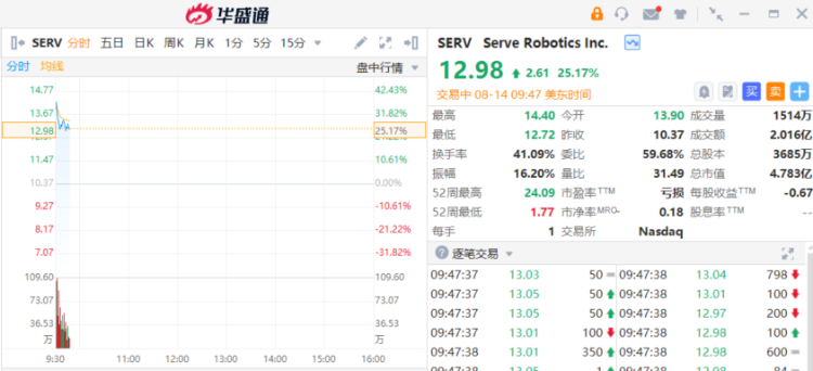 机器人公司Serve Robotics盘初涨超25%!公司Q2销售额超市场预期。