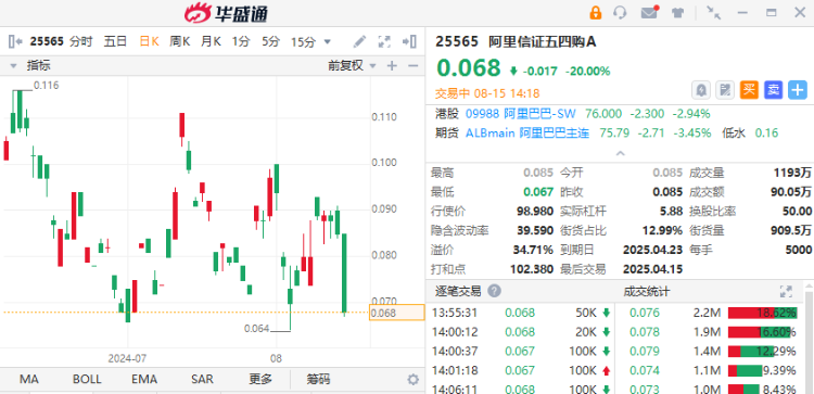 阿里认购证 $25565.HK ,行使价98.98港元,明年4月底到期,实际杠杆近6倍;淡仓方面,阿里认沽证 $25704.HK ,行使价60港元,12月初到期,实际杠杆逾8倍。