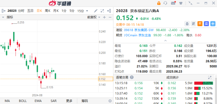 至于京东,好仓可以留意京东认购证 $26028.HK ,行使价103.88港元,为市场上最贴价的选择,明年6月底到期,实际杠杆逾3倍。