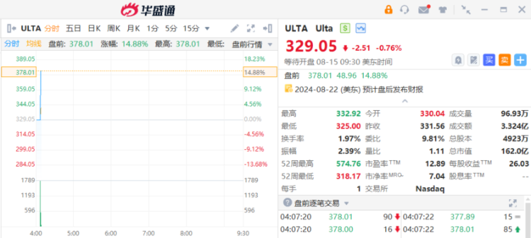 Ulta美容 $ULTA 盘前涨近15%,二季度获巴菲特建仓。