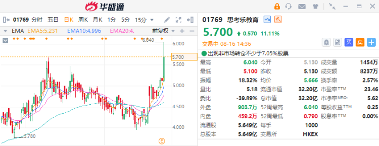 思考樂教育股价大涨逾11%,现报价5.7港元,成交额8237万港元。