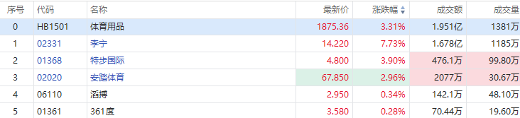 8月16日,港股体育用品股集体大涨,截至发稿,李宁绩后涨近8%,特步国际涨近4%,安踏体育涨近3%。
