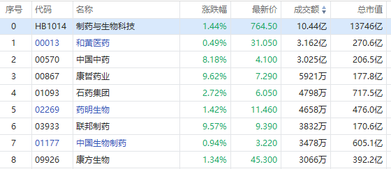 华盛资讯8月16日讯,港股早盘高开高走,医药股集体走高,截至发稿,康哲药业、联邦制药大涨逾9%,中国中药涨超8%,药明生物、康方生物涨超1%。
