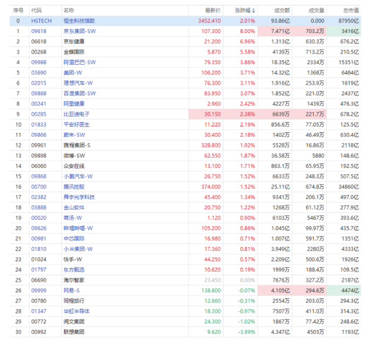 科网股集体拉升,京东集团-W绩后大涨8%,京东健康涨近7%;阿里巴巴-SW绩后涨3.86%;美团-W、百度集团-SW涨超3%。