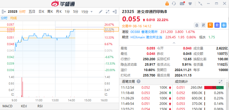 如投资者希望业绩前进场部署,看好可注意港交购 $23325.HK ,行使价250.2港元,实际杠杆12.5倍,2024年11月21日到期。如认为后市有下跌空间可参考港交沽 $21901.HK ,行使价221.8港元,实际杠杆8.9倍,2024年12月19日到期。