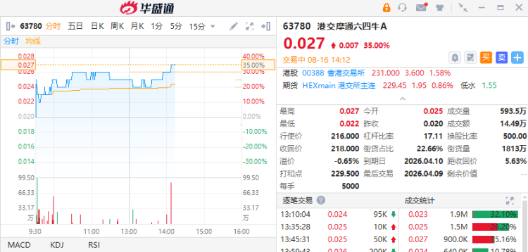 较进取投资者可参考港交牛 $63780.HK ,收回价218港元,实际杠杆17.4倍,2026年04月10日到期。如看淡正股后市可参考港交熊 $65346.HK ,收回价245港元,实际杠杆12.3倍,2026年12月11日到期。