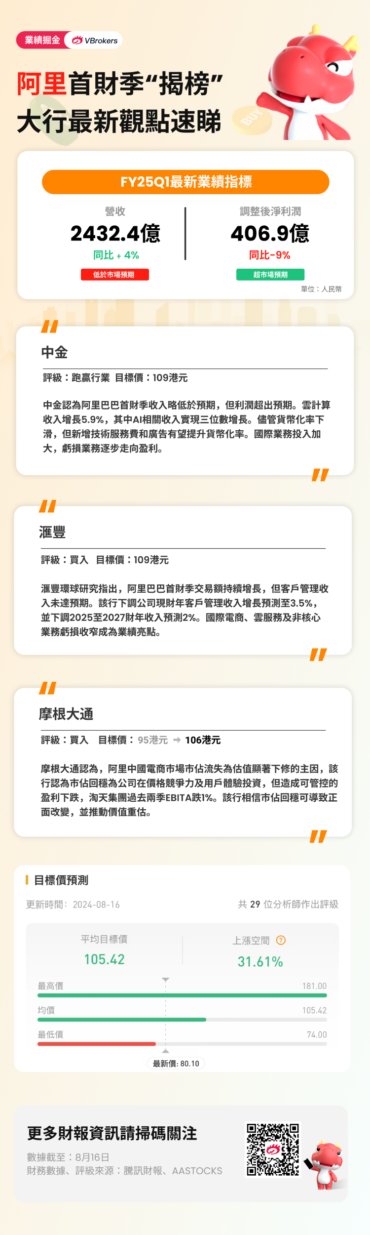 此外,公司将在8月22日举行股东大会,届时将向股东提交相关提案,如股东大会批准,预计8月底完成纽约香港双重主要上市。杰富瑞此前指,阿里巴巴完成双重主要上市后,9月24日有潜在纳入“港股通”机会,资金面将获改善,料对股价有正面催化作用。