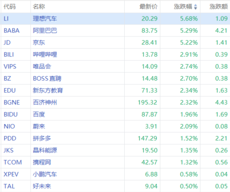 其中,理想汽车、阿里巴巴、京东涨超5%,哔哩哔哩、Boss直聘、新东方教育、蔚来涨超2%,拼多多涨超1%。