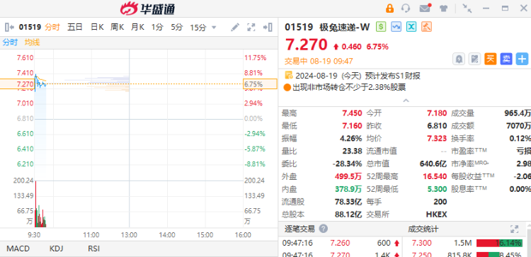 8月19日,极兔速递-W(01519)早盘走强,截至发稿,涨6.75%,报7.27港元,成交额7070万港元。