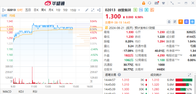8月19日,微盟集团(02013)股价走强,截至发稿,涨6.56%,报1.3港元,成交额4144万港元。