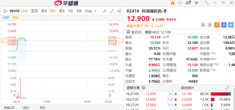 华盛资讯8月19日讯,港股同源康医药-B正在暗盘交易中,截至发稿涨6.61%,报12.9港元/股,中签一手账面浮盈400港元,最新总市值超47亿港元。该股预计将于8月20日正式挂牌上市,配售结果将于今日晚间披露。