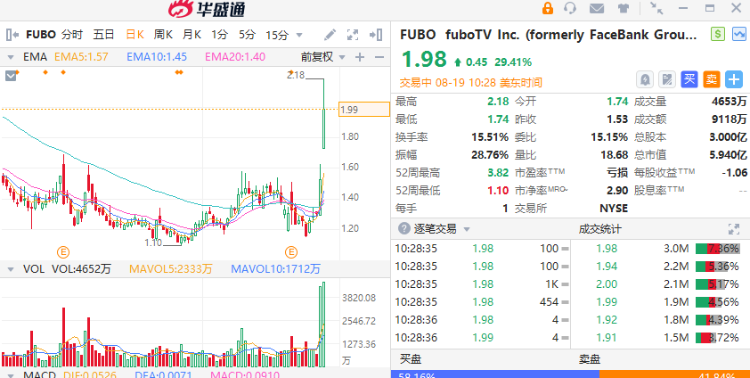 体育流媒体平台FuboTV(FUBO.US)美股涨超30%,报1.98美元。