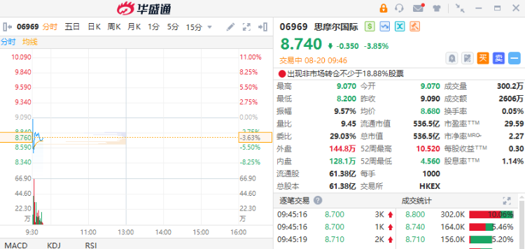 8月20日,思摩尔国际(06969)绩后一度跌超6%,截至发稿,跌3.16%,报8.8港元,成交额1534.94万港元。