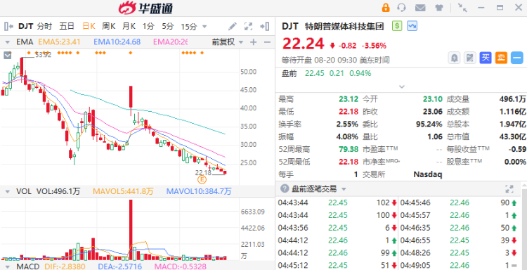 截至周一美股收盘,DJT股价跌至22.24美元,比借壳上市当天收盘价跌超60%,比该股最高收盘价下跌超66%。