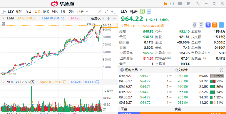 截至发稿,礼来大涨4.60%创历史新高,竞争对手诺和诺德涨0.74%