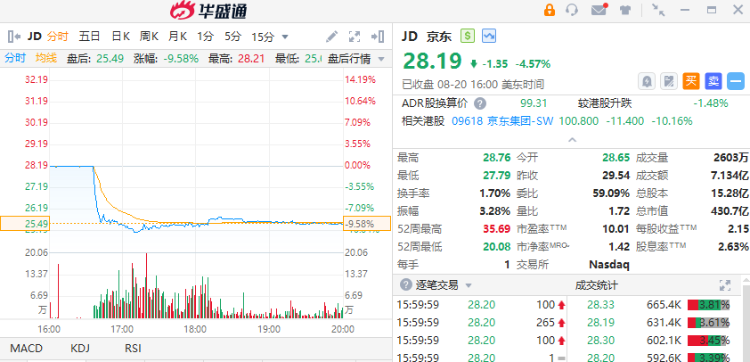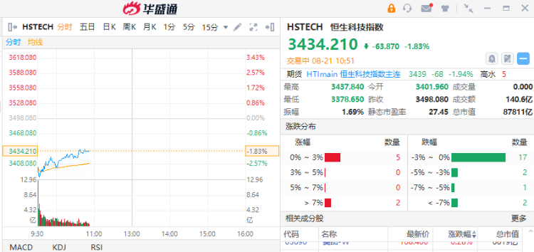 分析人士认为,中国上市公司正进入业绩披露高峰时段。由于二季度经济数据一般,市场普遍预期上市公司半年报可能也不会太好。反映在二级市场,相对就会比较谨慎。今天港股开盘,亦全线杀跌。恒指低开1.13%,恒生科技指数跌2.75%,京东跌超11%,微博跌4%。快手、小鹏汽车绩后分别跌近5%、4%。