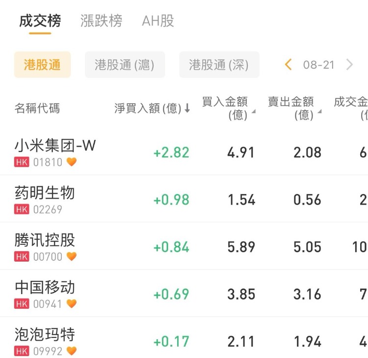 小米集团-W、药明生物、腾讯控股分别获南下资金净买入2.82亿港元、0.98亿港元、0.84亿港元;盈富基金、中国神华、美团-W遭净卖出4.17亿港元、1.04亿港元、1亿港元。
