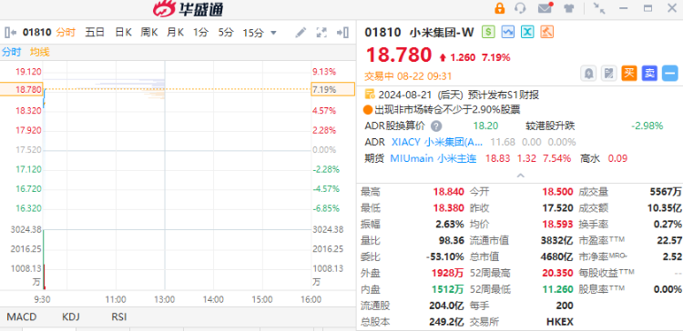 华盛资讯8月22日消息,港股早盘,小米集团-W大涨逾7%,报18.78港元,成交额10.35亿港元。