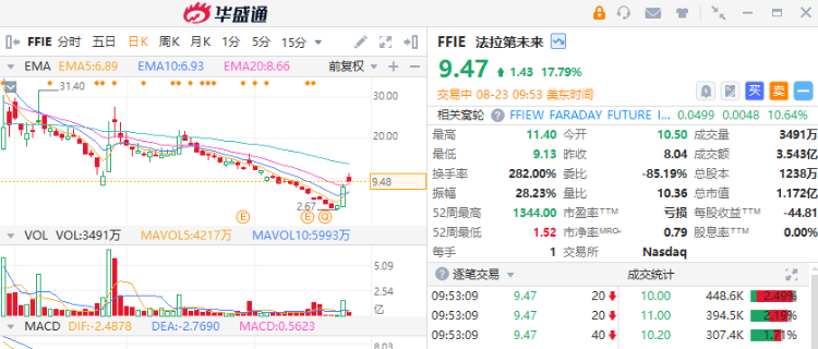 8月23日消息,法拉第未来(FFIE.US)周四收盘暴涨123.96%,今日盘初再度暴涨近40%,截至发稿涨18%。