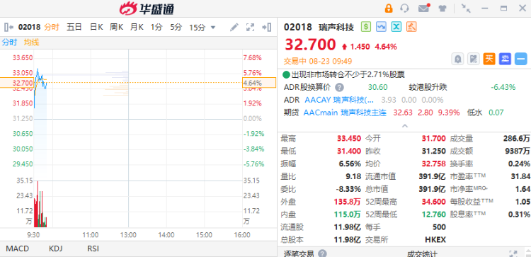 8月23日,瑞声科技(02018)股价再度走强,截至发稿,涨4.64%,报32.7港元,成交额9387万港元。