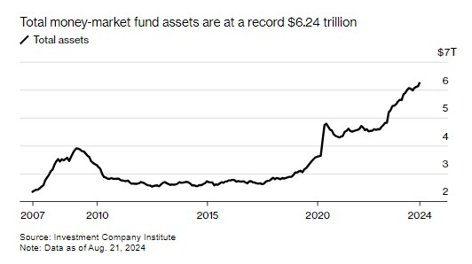 在美联储降息行动开始前,投资者开始涌入货币市场基金。美国银行数据显示,在截至周三(8月21日)的一周内,投资者向货币市场基金注入了370亿美元,试图为美联储9月降息做准备。因为这些基金中的短期固定收益证券的种类繁多,这意味着它们往往能提供比短期美国国债更高的回报。