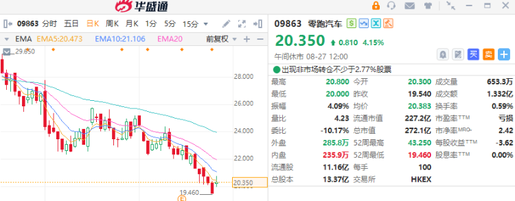 零跑汽車(09863.HK)大股東計劃增持,金額不超過3億人民幣,股價今日回升,最高見20.8元。現報20.45元,升4.66%,成交641.75萬股,涉資1.31億元。