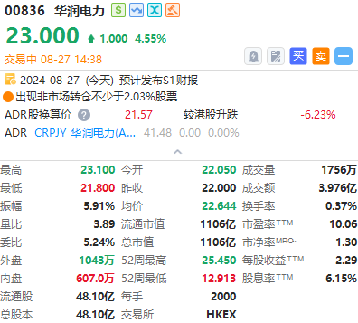华润电力(00836)午后转涨逾4%。截至发稿,涨4.55%,报23港元,成交额3.98亿港元。
