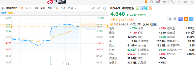 中海物业(02669)午间发布业绩,股价一度涨超7%。截至发稿,涨5.94%,报4.64港元,成交额3812.97万港元。