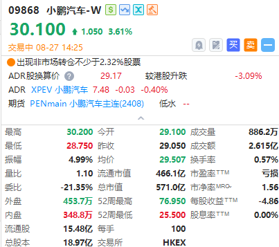小鹏汽车-W(09868)涨近4%,截至发稿,涨3.61%,报30.1港元,成交额2.61亿港元。