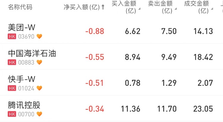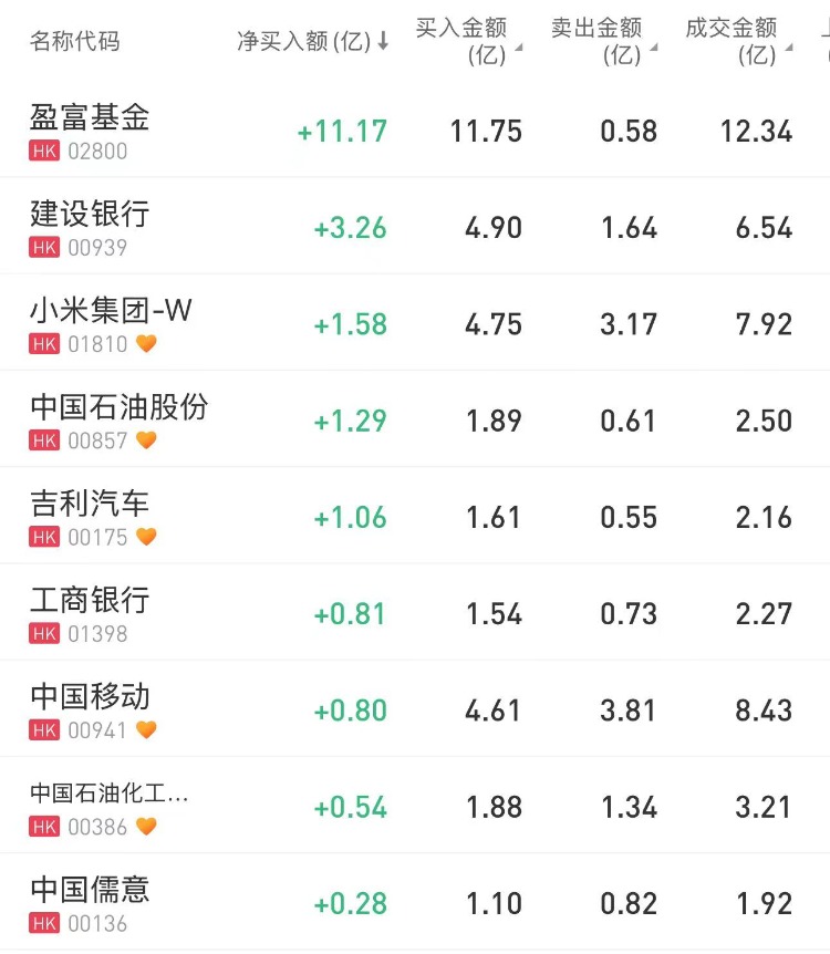 盈富基金、建设银行、小米集团-W分别获南下资金净买入11.17亿港元、3.26亿港元、1.58亿港元;美团-W、中国海洋石油遭净卖出0.88亿港元、0.55亿港元。
