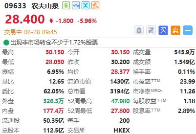 农夫山泉(09633)绩后股价受压,截至发稿,报28.4港元,跌5.96%,成交额1821.96万港元。