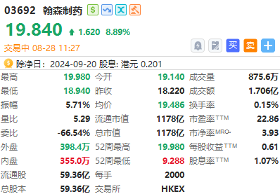 翰森制药(03692)早盘持续走高,股价上涨8.99%,现报19.84港元,成交额1.706亿港元。