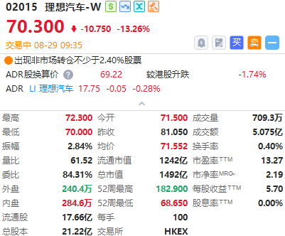 理想汽车-W(02015)绩后大跌超13%,报70.3港元,成交额5.075亿港元。