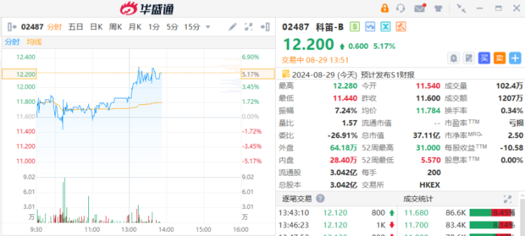 科笛-B $02487.HK 午后涨超5%,截至发稿,涨5.17%,报12.2港元,成交额1207万港元。