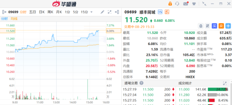 顺丰同城 $09699.HK 涨超6%,截至发稿,涨6.08%,报11.52港元,成交额635万港元。