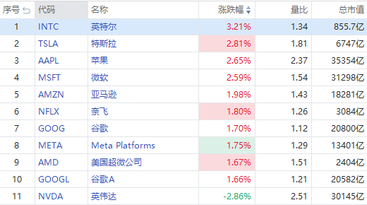明星科技股集体走高,截至发稿,英特尔涨超3%,特斯拉、苹果、微软涨近3%,亚马逊、奈飞、谷歌、Meta $META 、美国超微公司等涨近2%。
