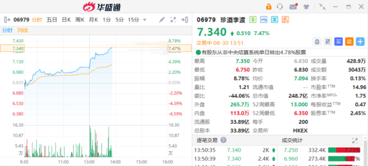 珍酒李渡 $06979.HK 午后涨超7%,截至发稿,涨7.47%,报7.34港元,成交额3043万港元。