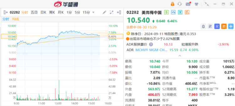 美高梅中国 $02282.HK 盘中一度涨超8%,截至发稿,涨6.46%,报10.54港元,成交额1.066亿港元。